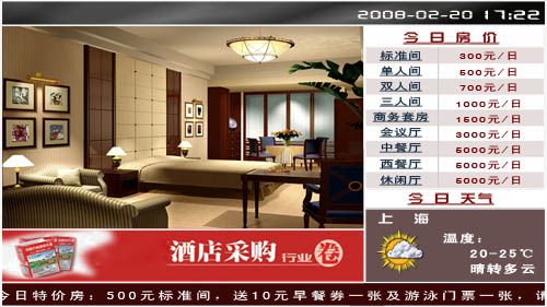 在酒店的电梯口、过道、大厅等场所设置显示终端,播放酒店的各种服务信息,使住客能更全面地了解酒店,产生更多的服务要求,也有利于树立酒店的形象;