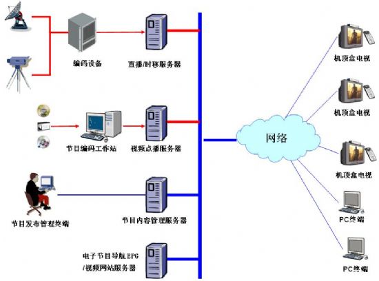 清鹤数码提供的VOD视频点直播系统,结合公司目前的IPTV技术,采用公司自主研发的清鹤流媒体服务器Clear Server,通过计算机网络传输数据,用户终端不仅可以使用机顶盒+电视机/显示器为显示终端,同样可以利用网络实现基于web平台的PC终端,如用户有需求,可以实现在手机上进行播放的移动终端。
